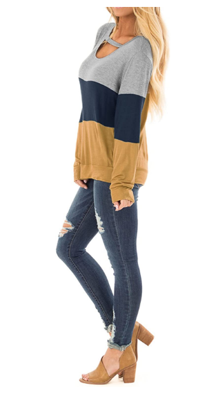 ♥ Features: Colorblock top, cutout on chest, neck collar, round neckline, long sleeves, loose casual style, stretch knit.